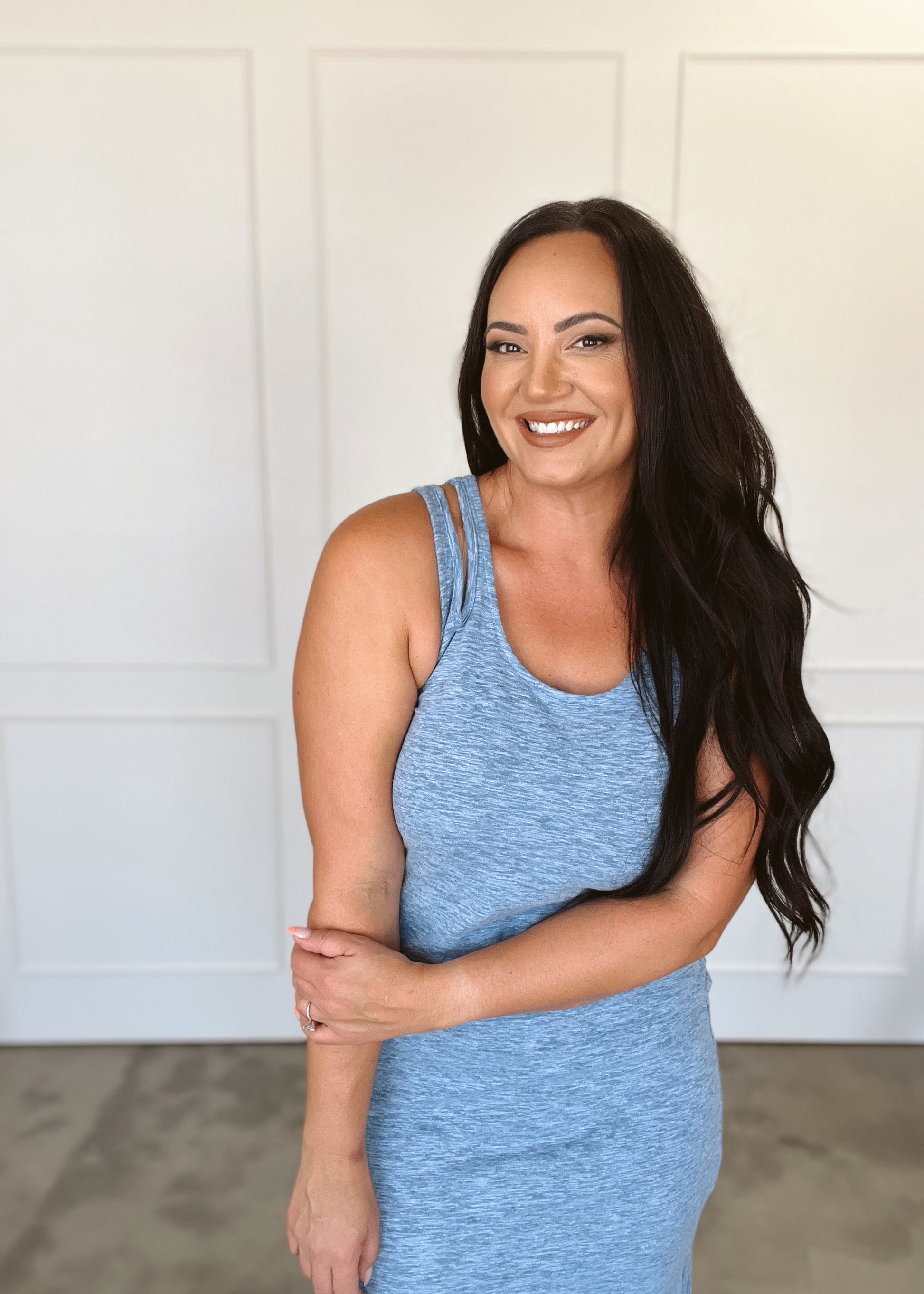 The perfect everyday body con dress in our cotton slub fabric. Features an asymmetrical strap, curved neckline and maxi length in a gorgeous chambray color.